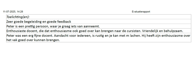 Hier een screenshot van een enkele beoordelingen van de cursisten.